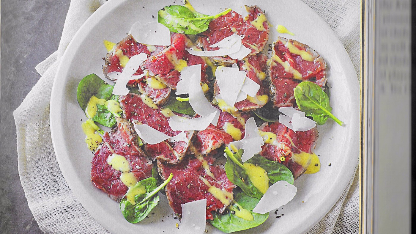 Place the spinach on a large serving plate and top with the slices of beef so they overlap.